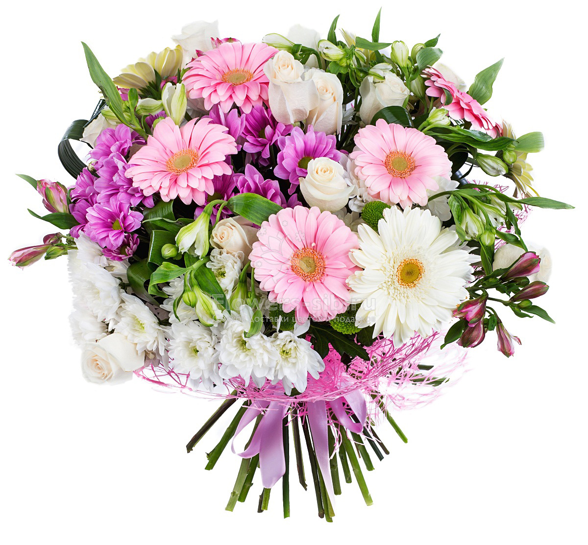 Роза - 11 шт. • Хризантема белая - 3 шт. • Хризантема розовая - 2 шт. • Гербера - 9 шт. • Альстромерия - 10 шт. • Аспидистра - 5 шт. • Сетка • Лента